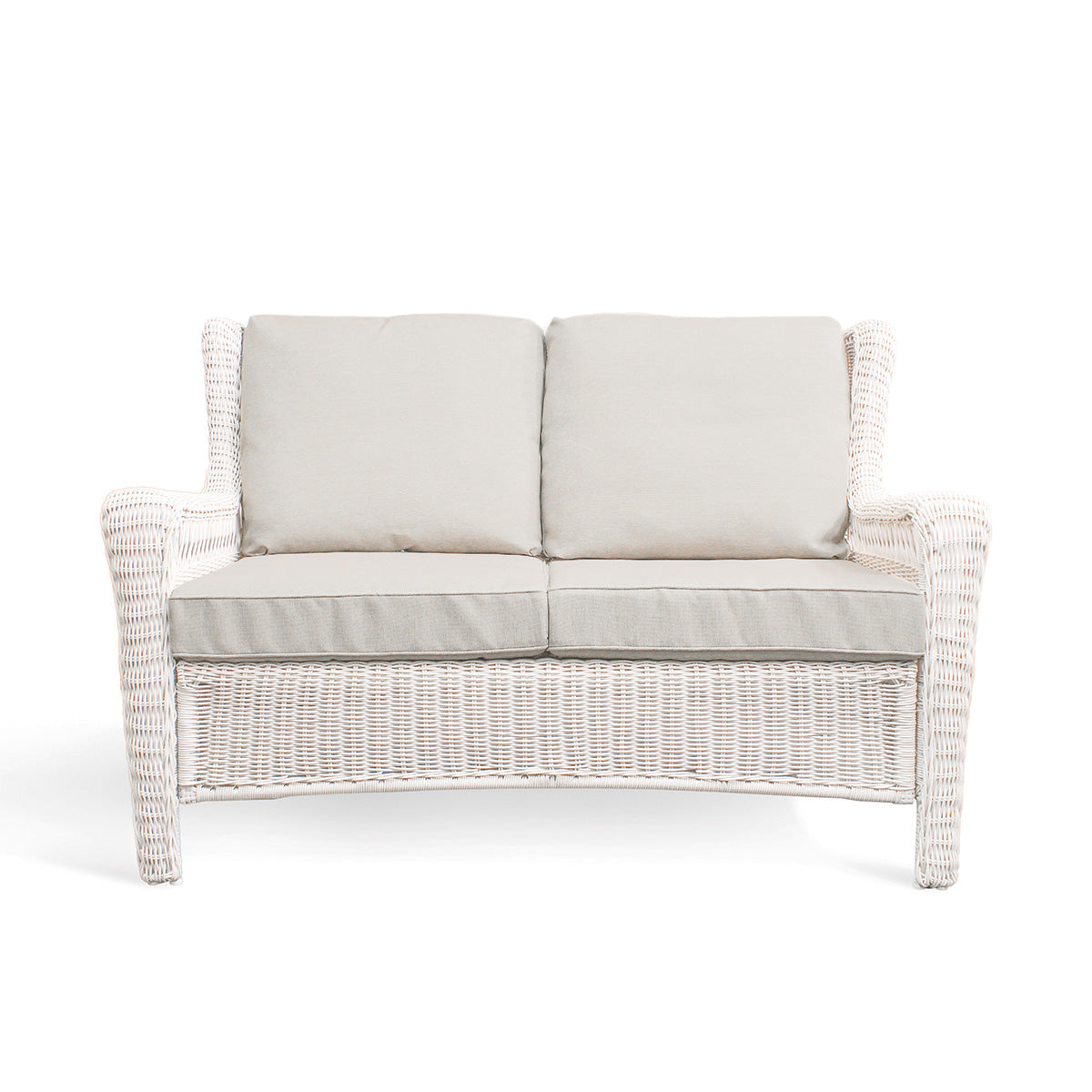 Gorgeously woven outdoor wicker loveseat in a luminous white cream finish. Features open diamond weave details on sides and back. Beachy, breezy, and a delight to style, this chair is the perfect addition to your backyard oasis. Pairs beautifully with a variety of colours and spaces.