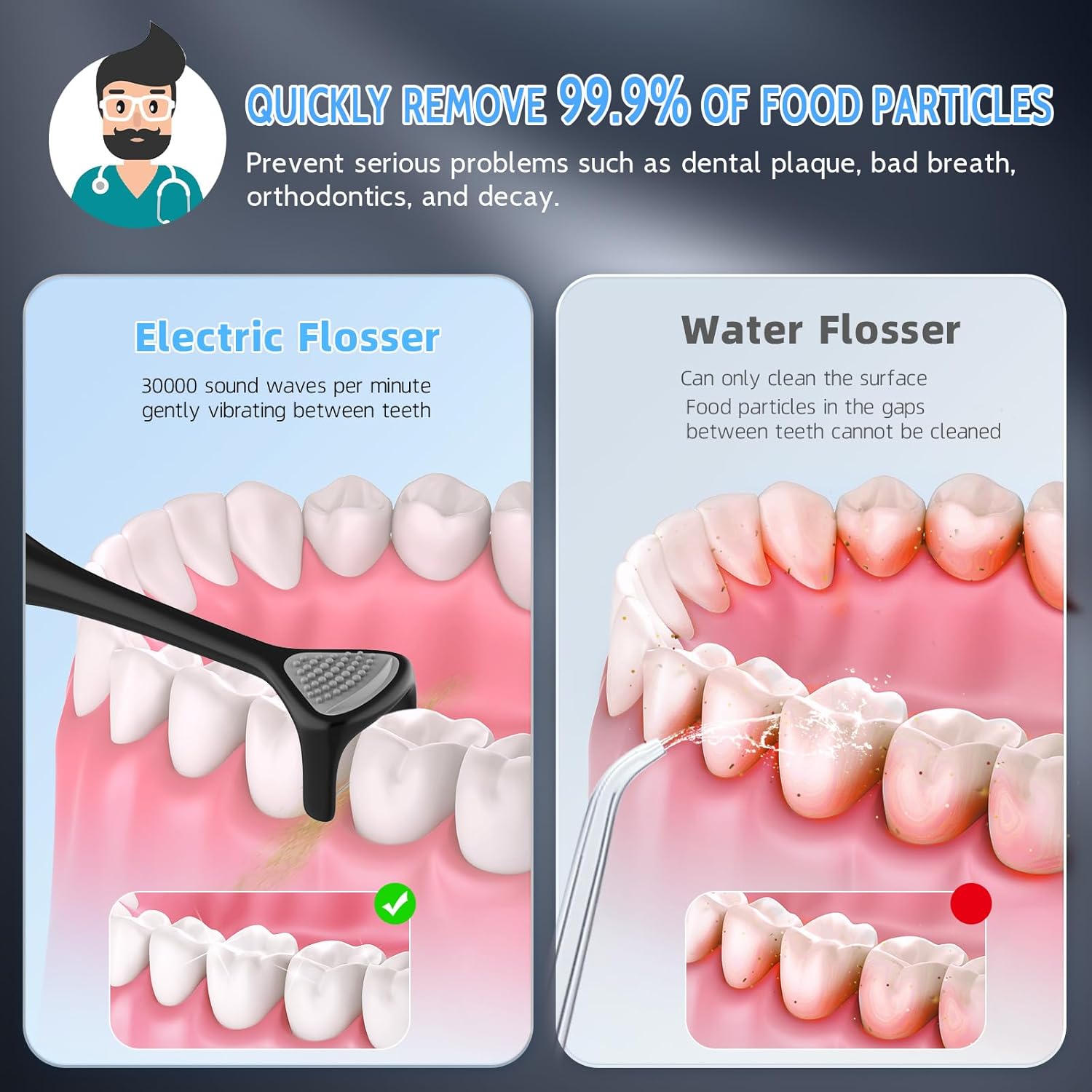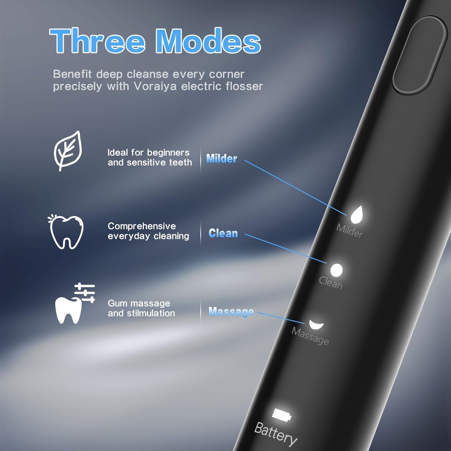 - Complete Oral Care Experience: The Voraiya power dental flosser is a 3-in-1 tool that not only flosses your teeth, but also massages your gums & cleans your tongue. This dental pick massages the gums, promotes blood circulation, and addresses oral issues like bad breath, orthodontic teeth.